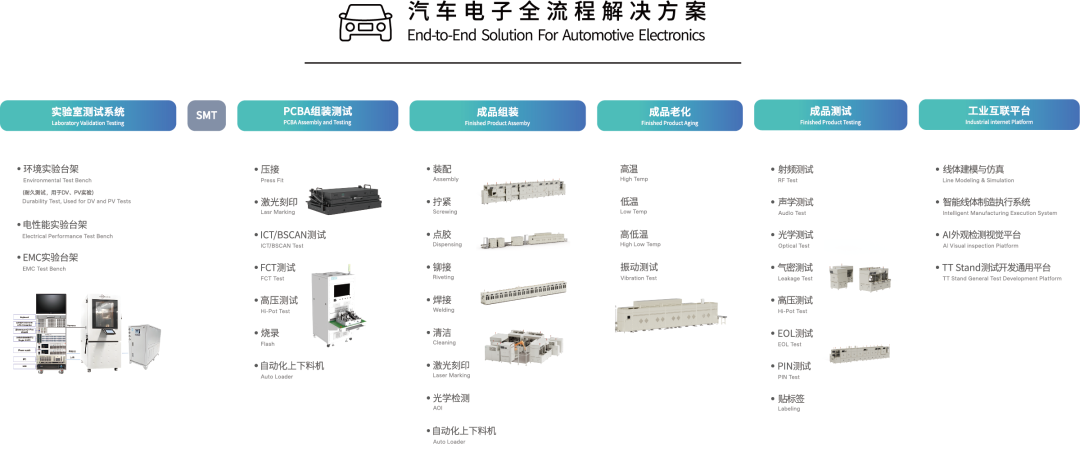 特创科技在车载信息与娱乐系统领域积累了丰富的经验,我们的自动化解决方案覆盖了从实验室验证阶段、PCBA到成品测试的完整链条,为客户提供高精度测试及自动化组装产品及服务。我们致力于通过技术创新,推动新能源汽车行业的智能化发展,为消费者带来更加智能、便捷的驾驶体验。